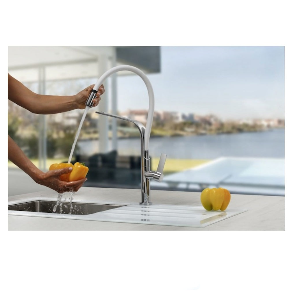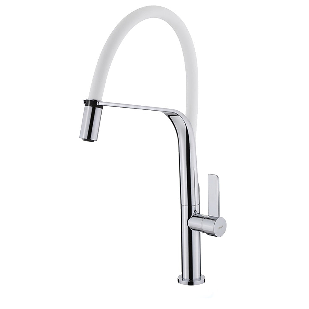 Baterie de bucatarie Teka FO 997 W, cu teava inalta, semiprofesionala, tub flexibil din cauciuc, Alb/Crom