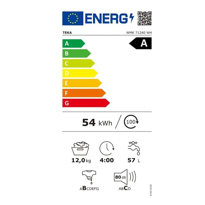 Masina de spalat rufe Teka WMK 71240 WH, 12 kg, 1400 rpm, 14 programe de spalare, 60 cm, Clasa A, alba